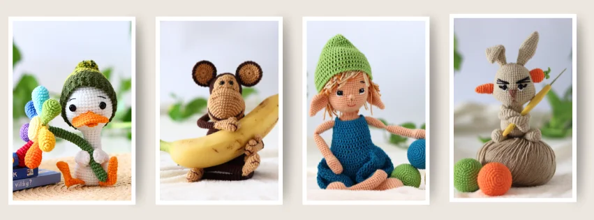 The patterns in the collage – you can grab them by clicking on their names: Cute duck crochet pattern, Alfred, the monkey, Irid, the elf, Grumpy Easter bunny