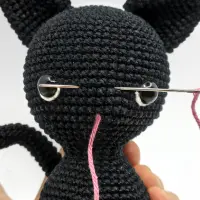 Sew the legs to the body. Pin the front legs starting from the 37th row of the body, and sew them. Pin the back legs to the bottom of the cat in the marked places, and sew them.
