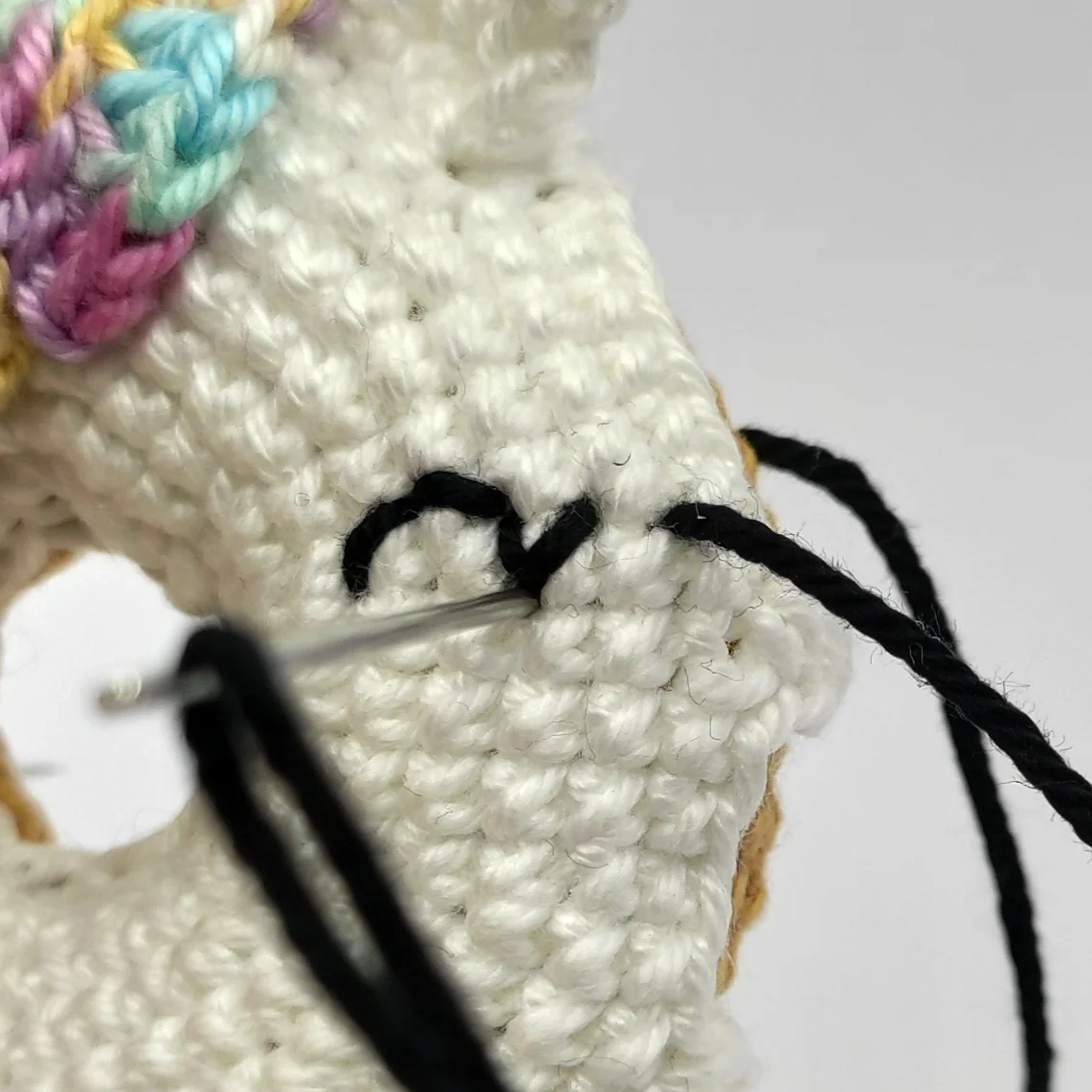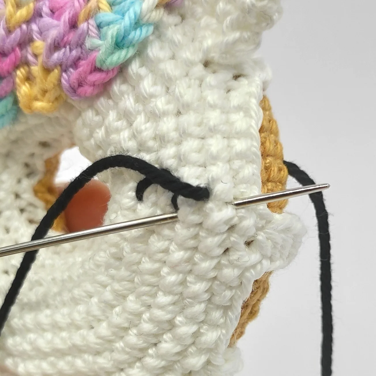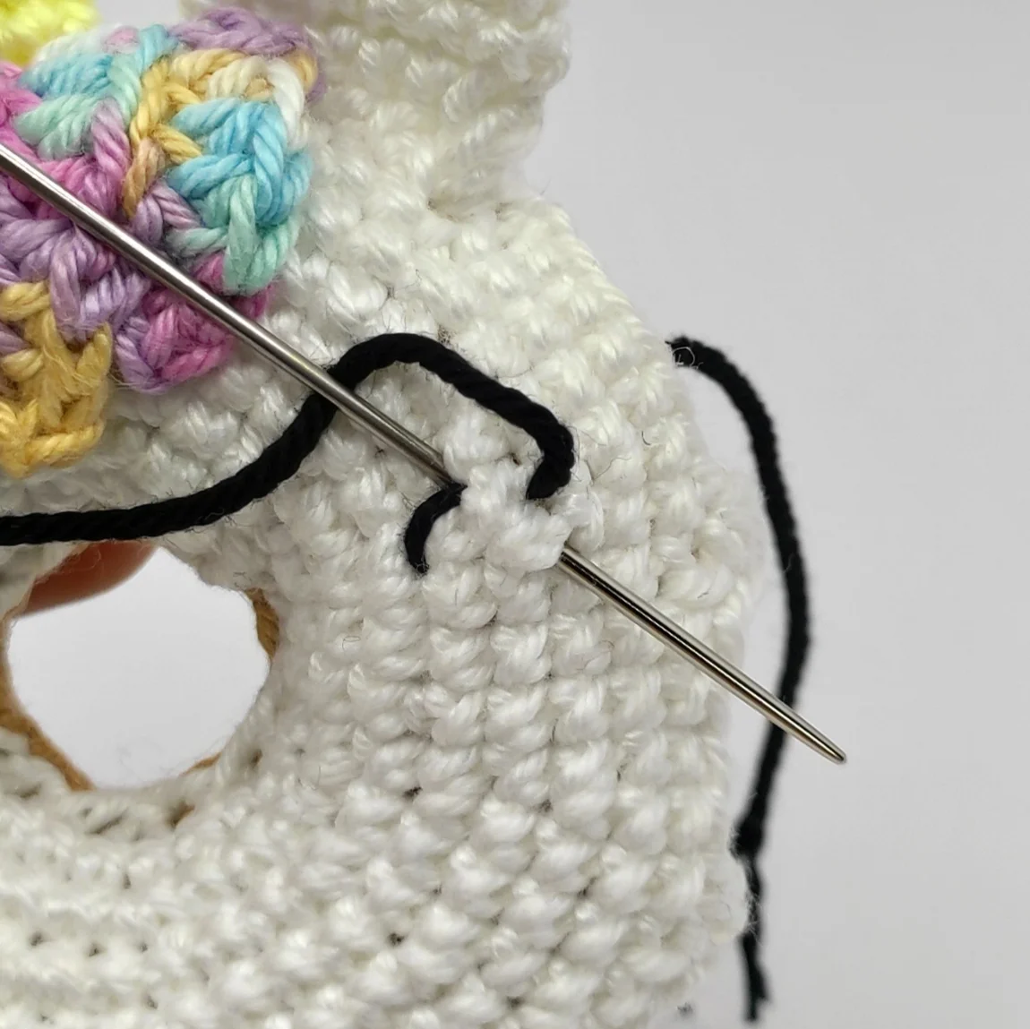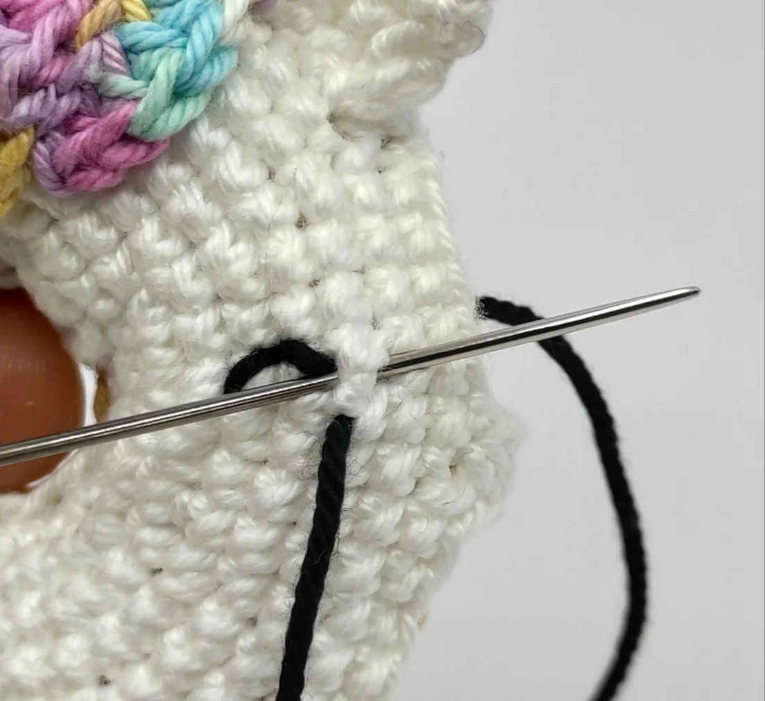 Cut the yarn, lightly stuff the horn, pin it to the side of the donut above the hair, then sew it on. After that, weave in the yarn end.