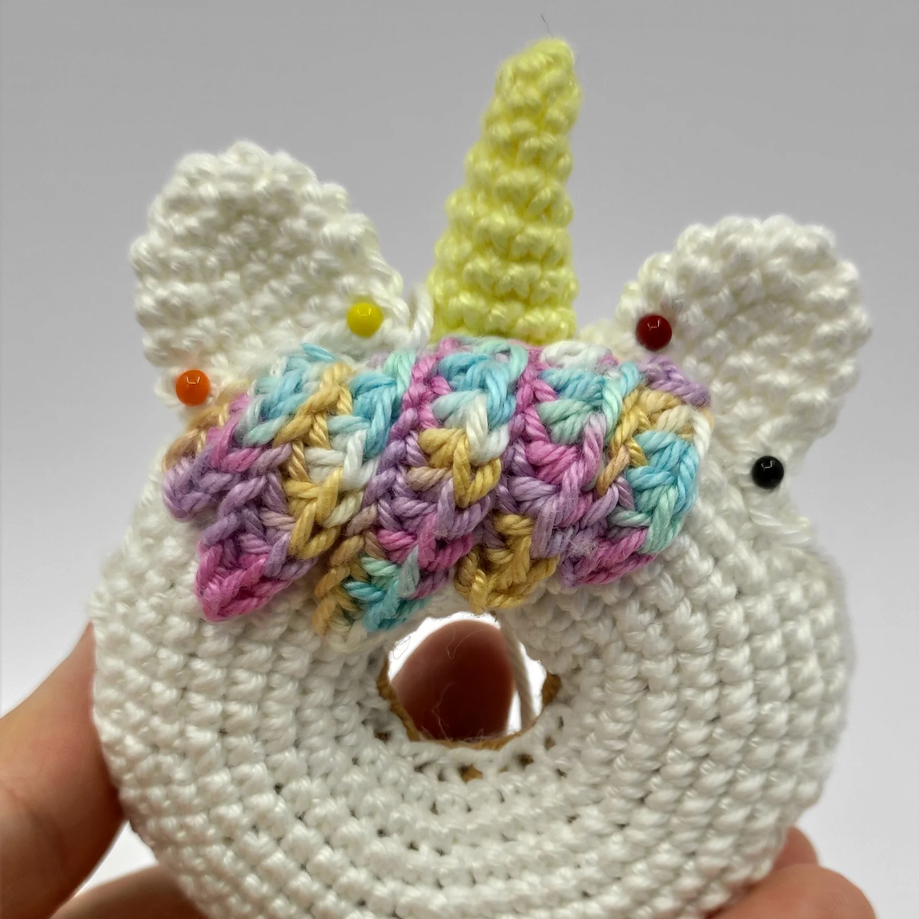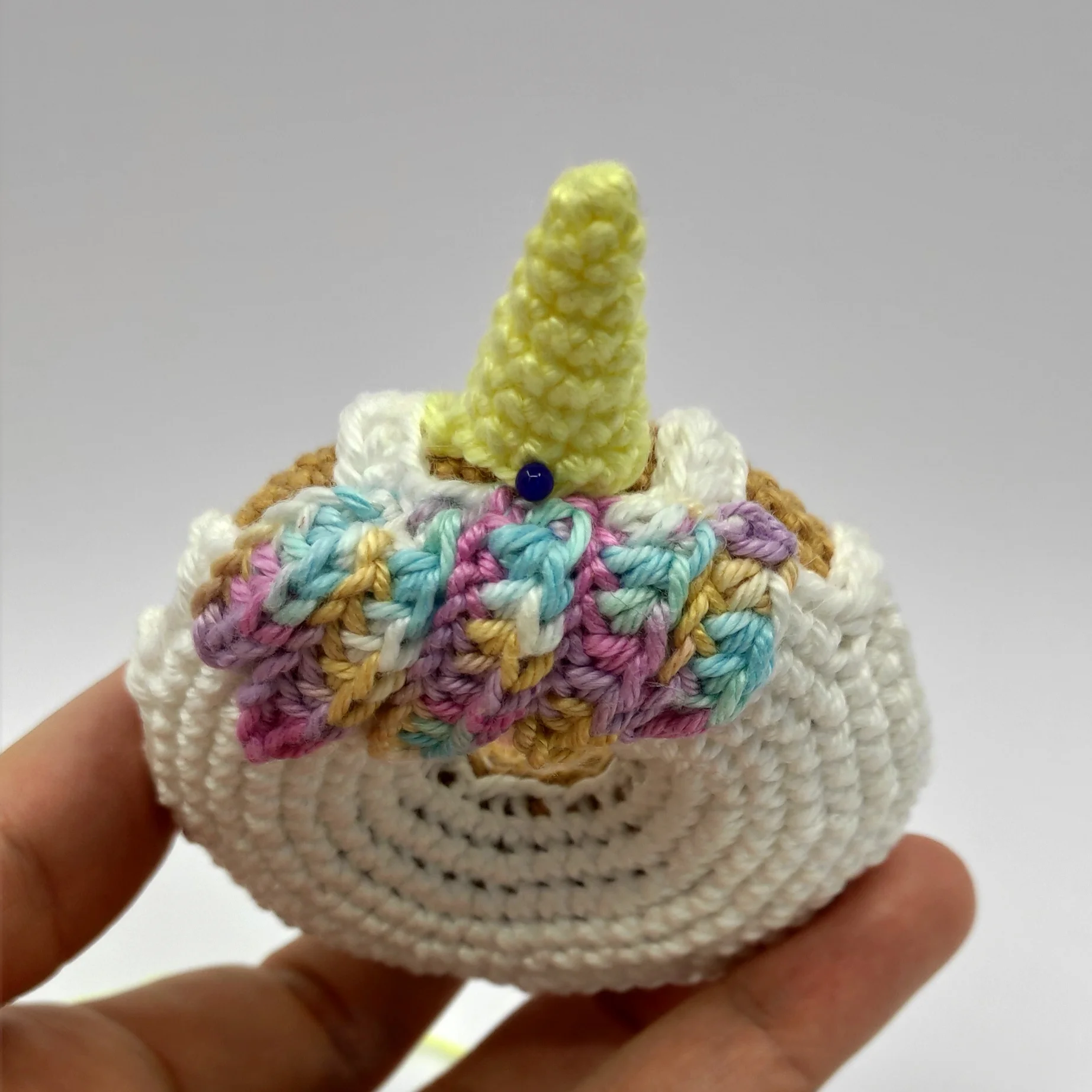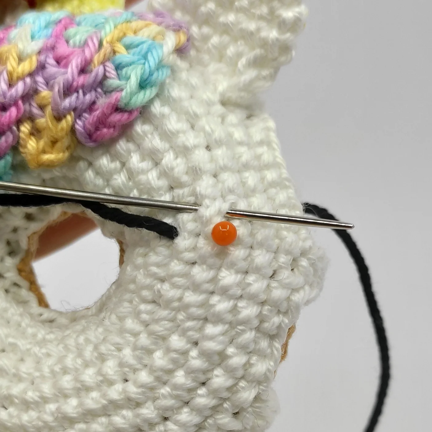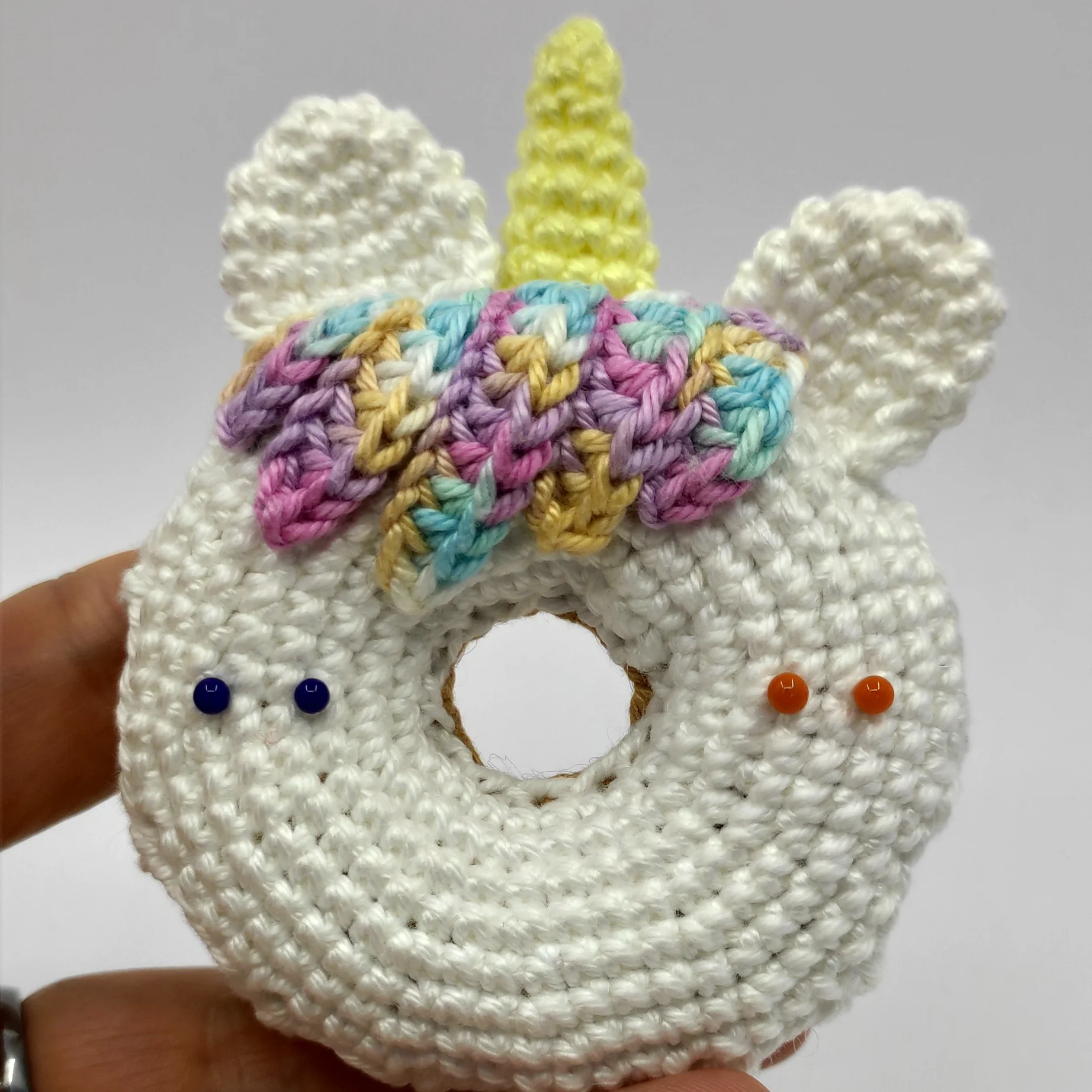 Cut the yarn, lightly stuff the horn, pin it to the side of the donut above the hair, then sew it on. After that, weave in the yarn end.