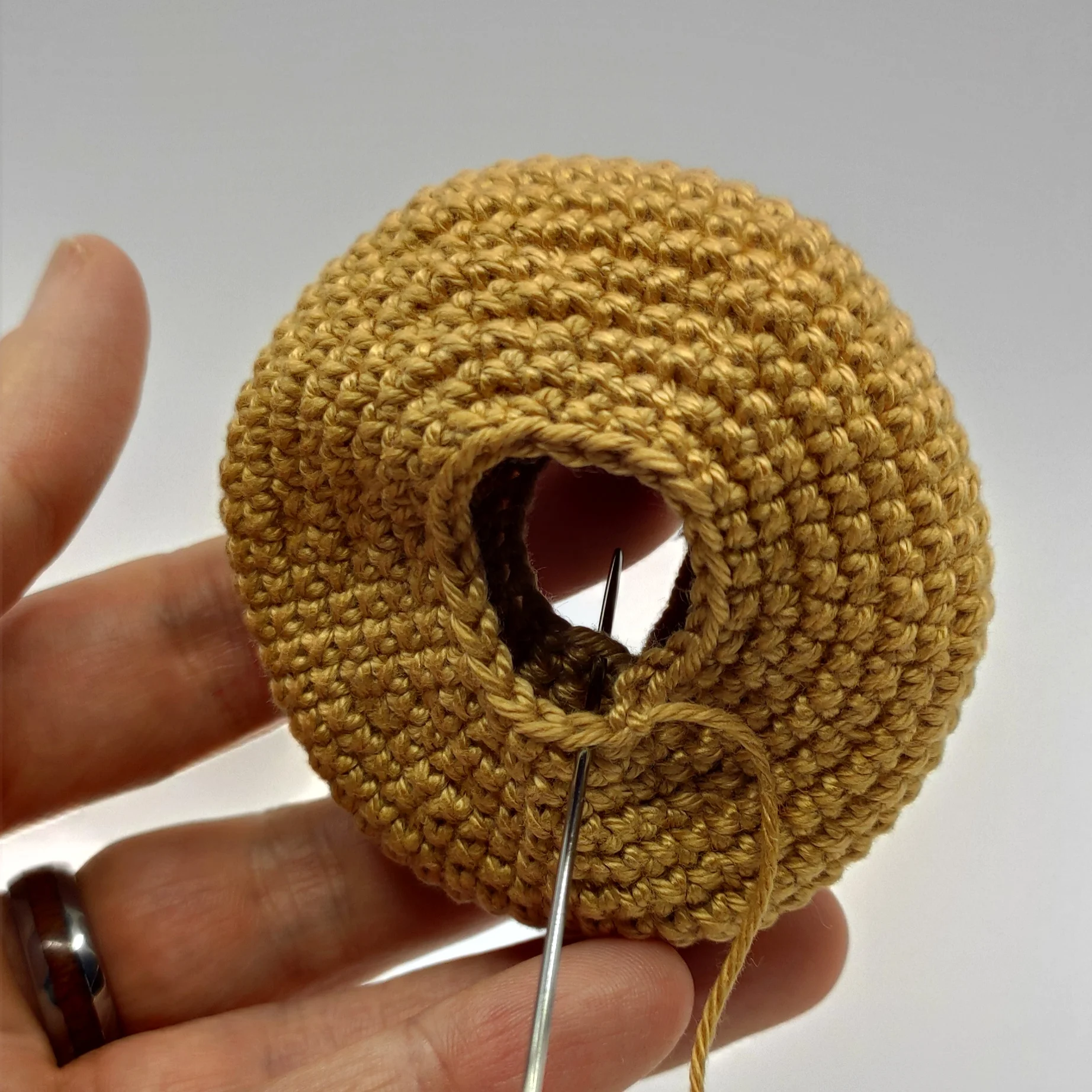 Cut the yarn, leave a long tail for sewing. Fold the donut in half, then sew it together. Stuff it while sewing. After that, weave in the yarn end.