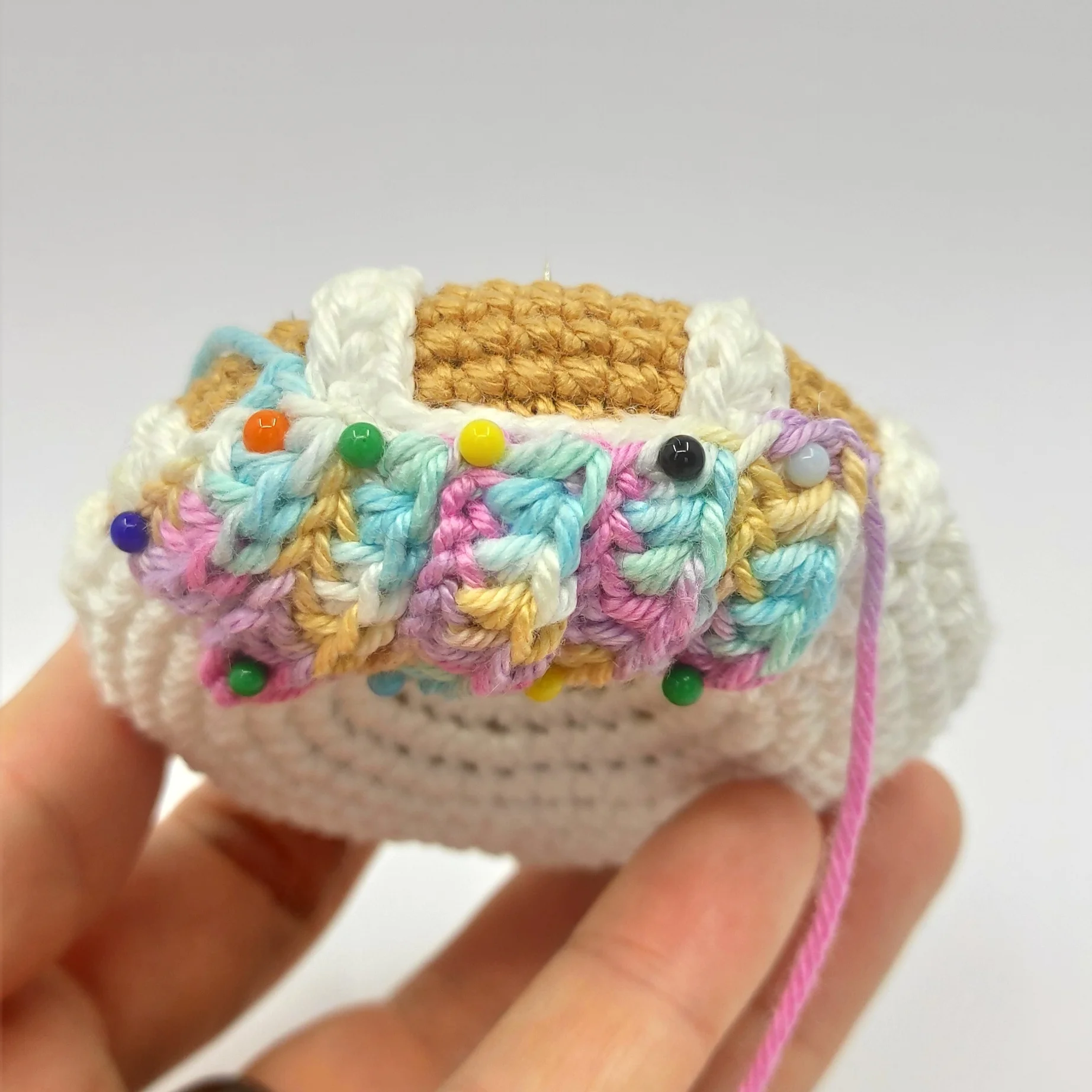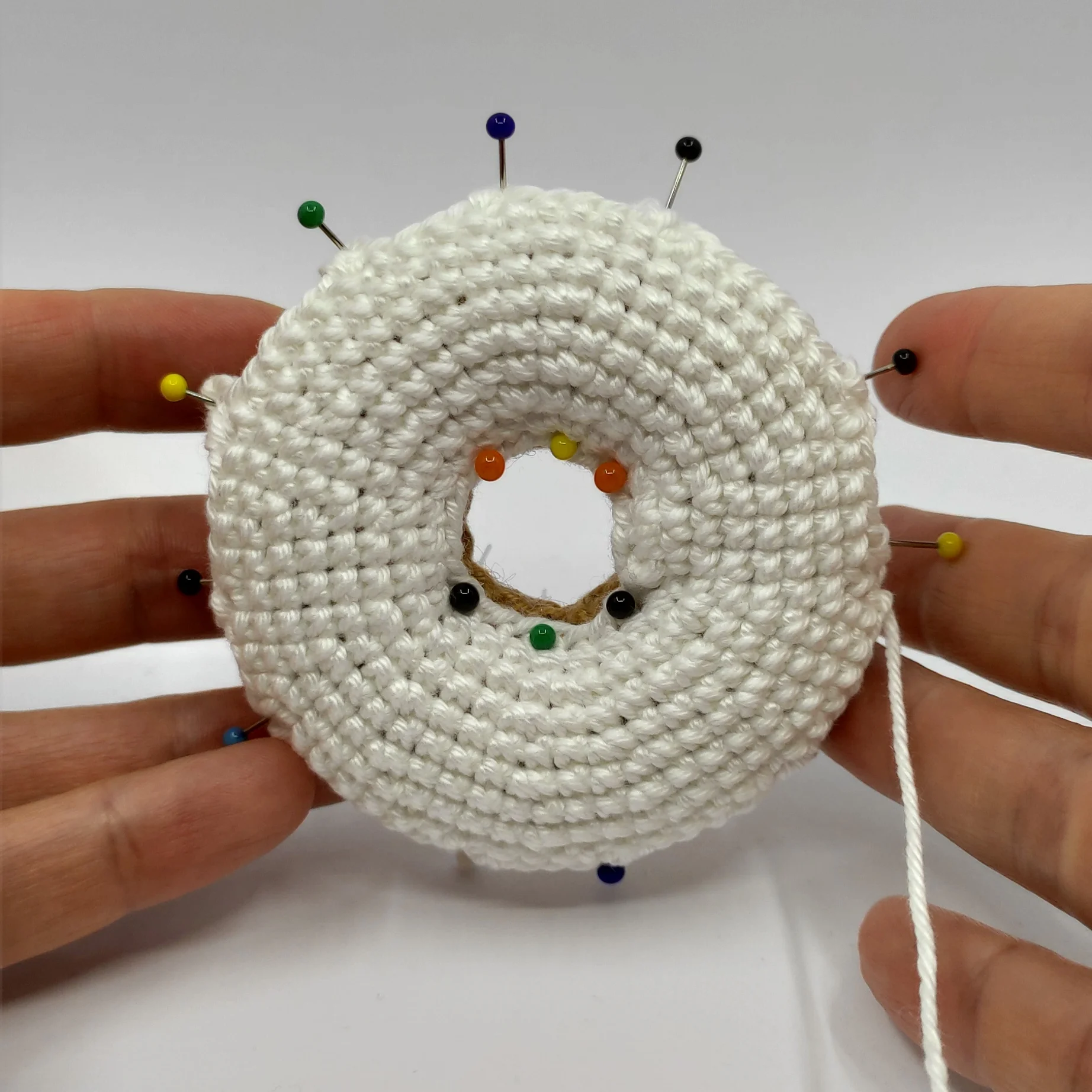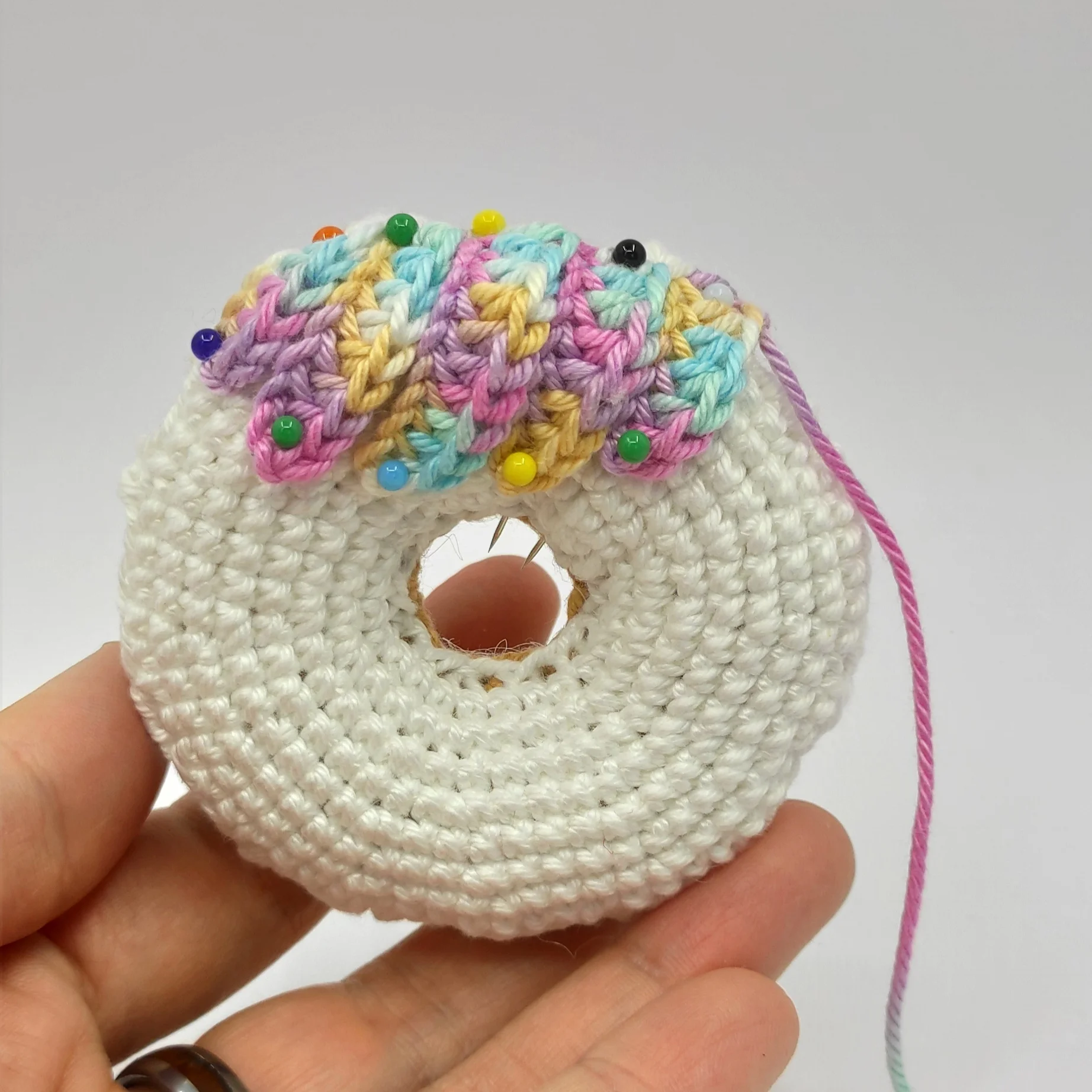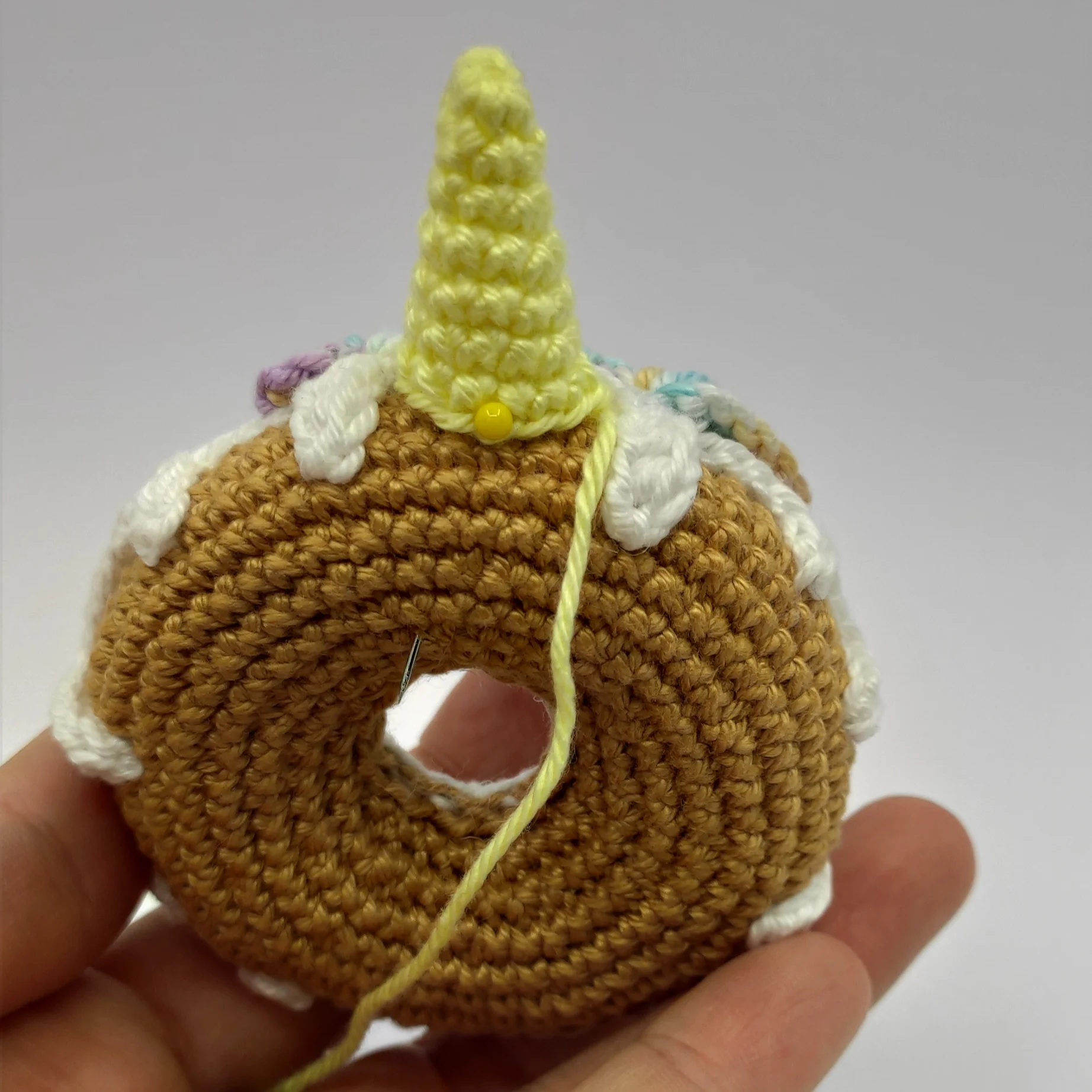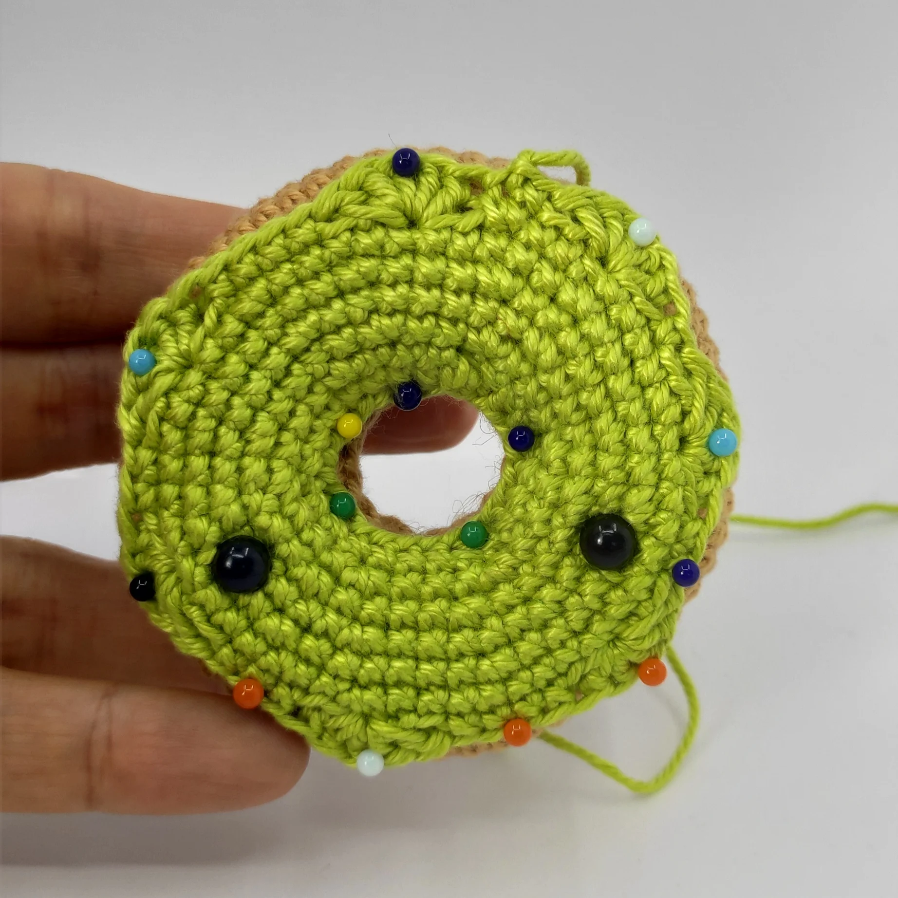 Cut the yarn, leave a long tail for sewing. Pin the icing to the donut, then sew it on. After that, weave in the yarn end.