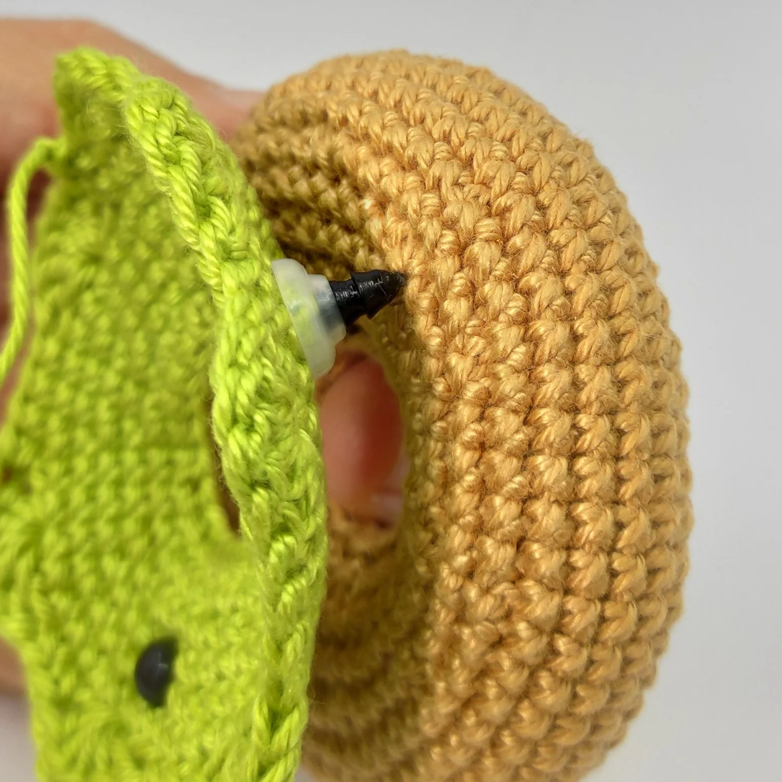 Insert the safety eyes between rounds 4-5, 17 stitches apart. When sewing, press the back of the safety eye into the donut.