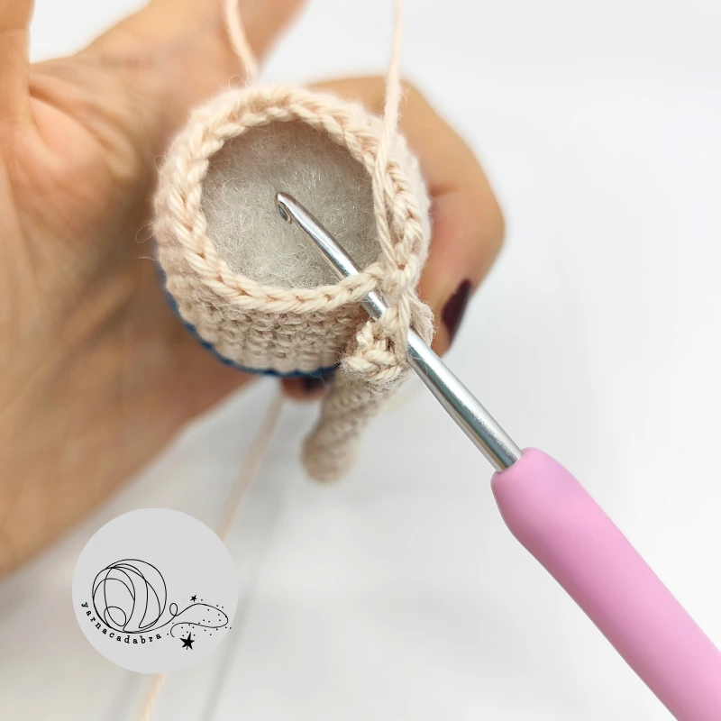 35. 4 sc, 2 sc crocheting through body and arm, 10 sc, 2 sc crocheting through body and arm, 4 sc (22)