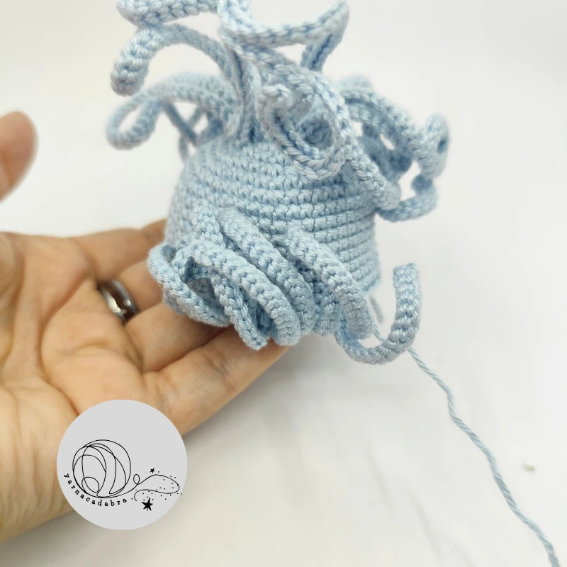 ch 21, turn, starting in the second ch from hook, sl st in each ch across, sl st in the next st on the base. Repeat from to * to make a total of 10 curls.