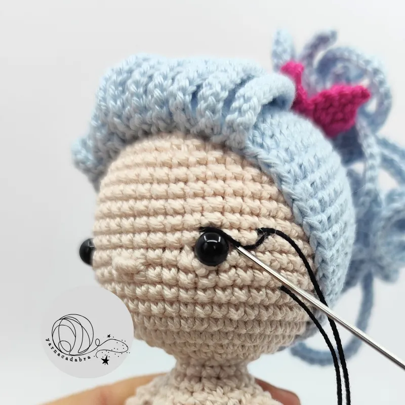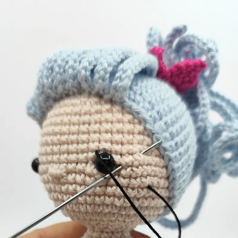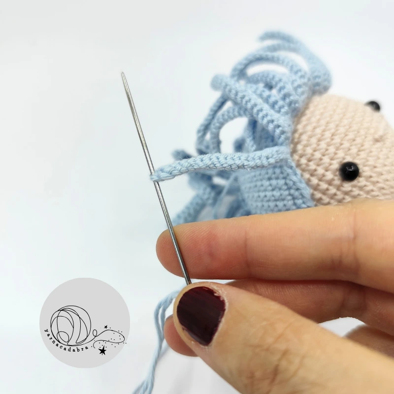 After finishing the second part, pin the hair to the head and then sew it on. The curls should be at the front. After sewing, thread the pigtails one by one onto a needle and tack them down onto the hair base.