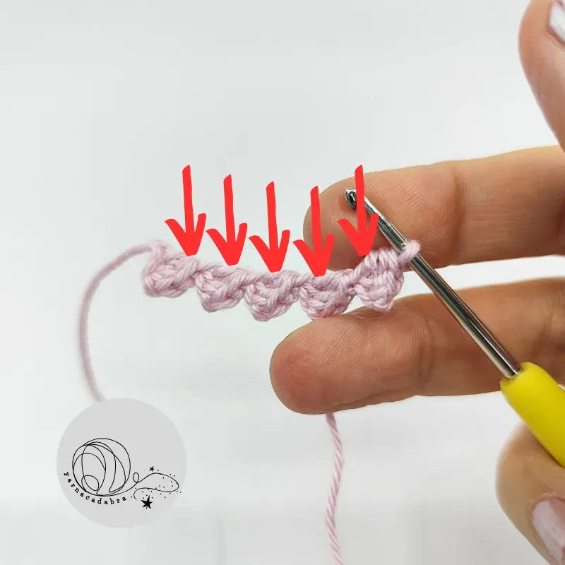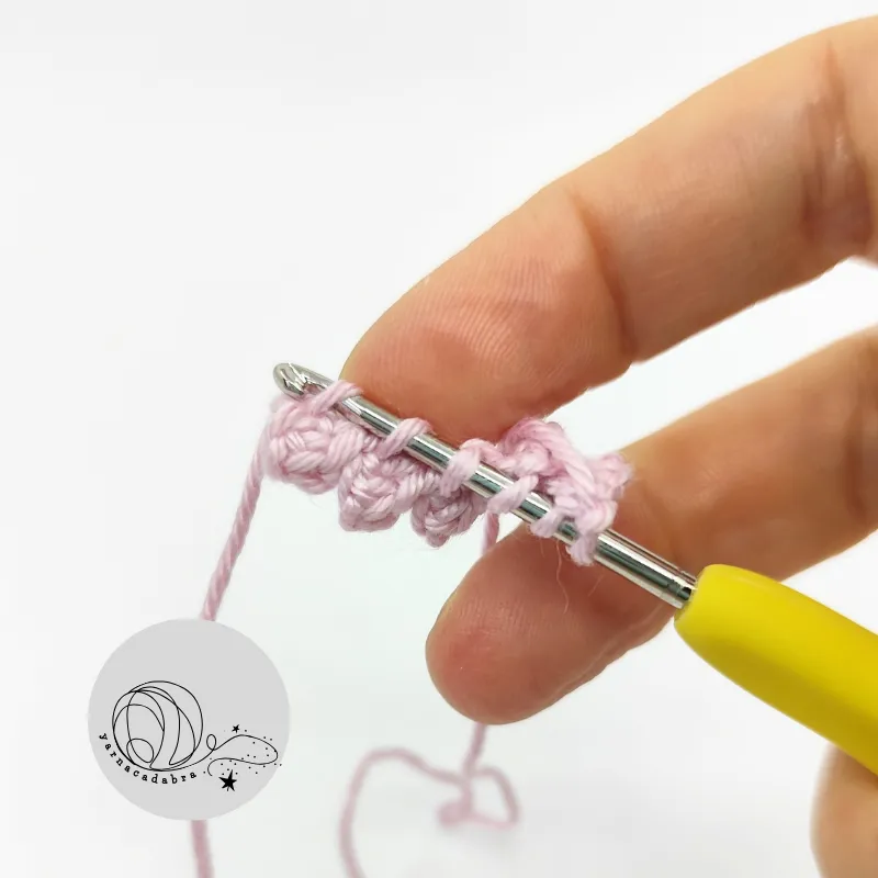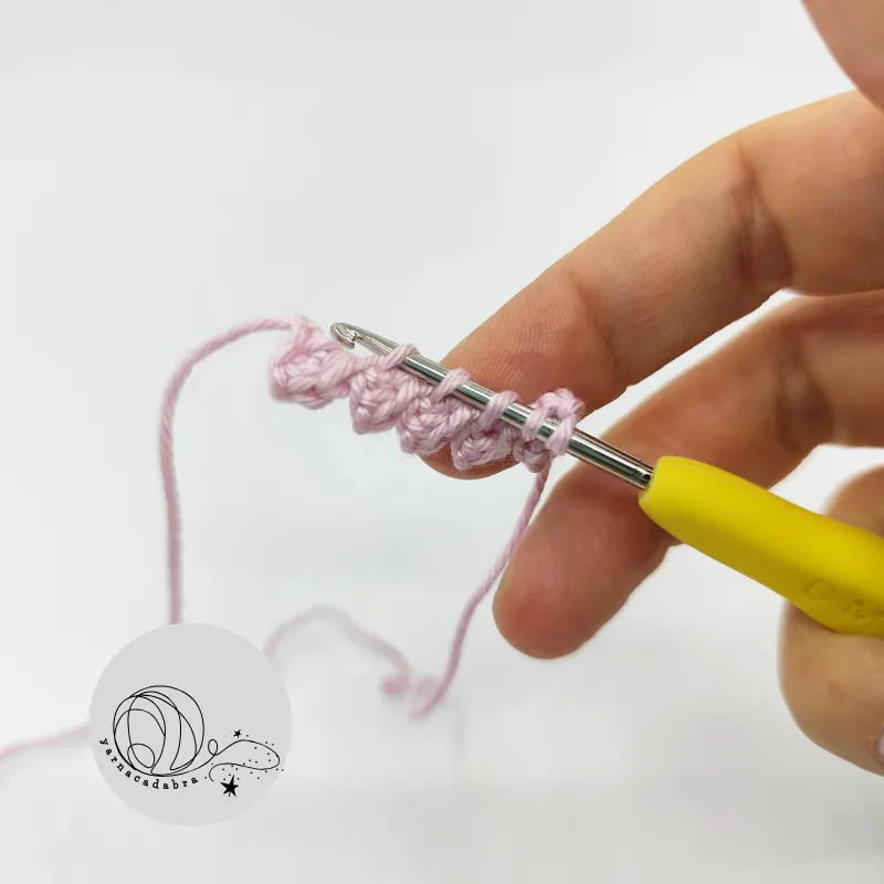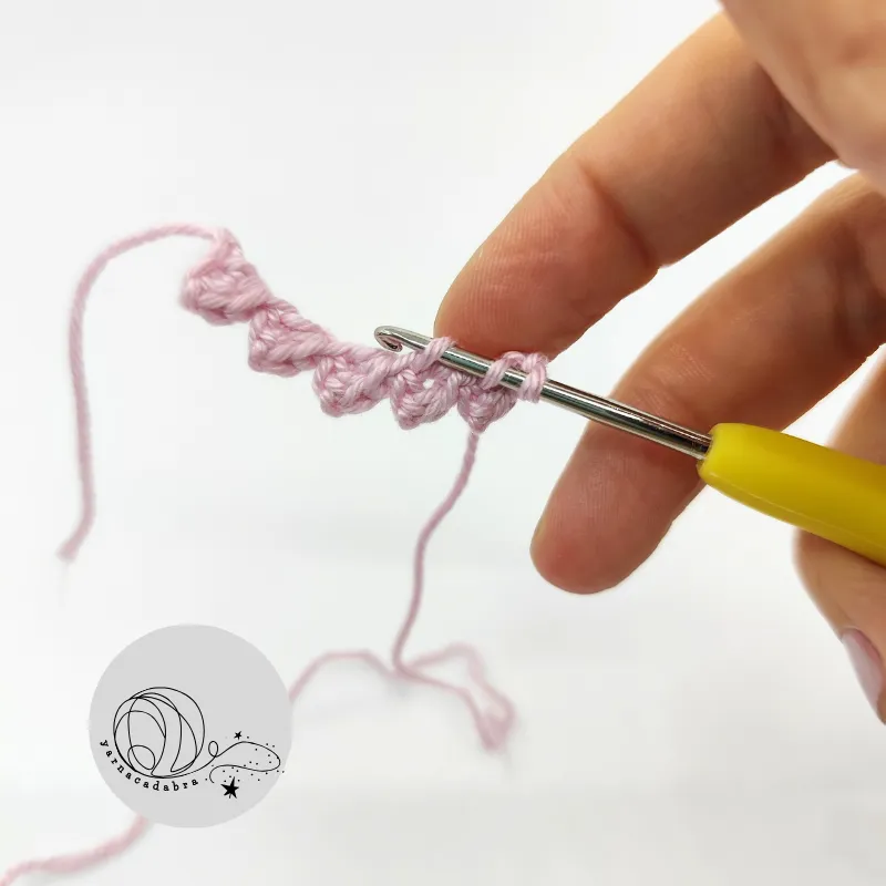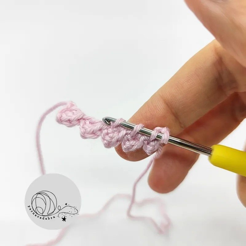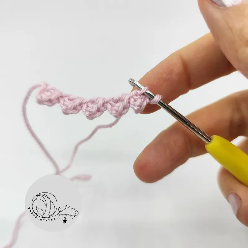1. sc in the next 13 ch, skip 1 st, 4 dc in the next st, skip 1 st, sc in the next 2 st, skip 1 st, 4 dc in the next st, skip 1 st, sc in the next 13 st, ch 1, turn (36)